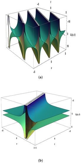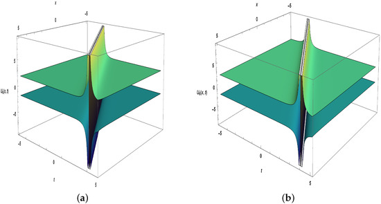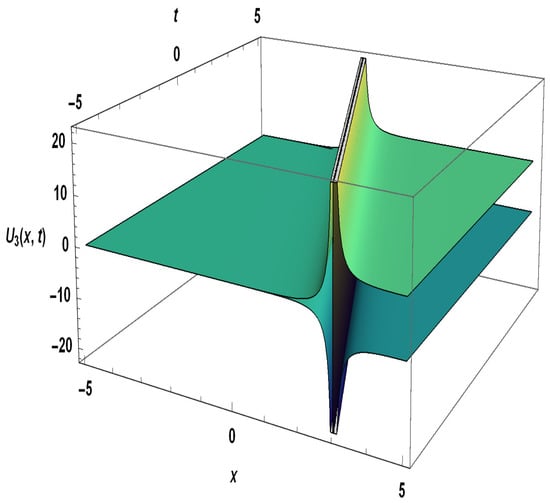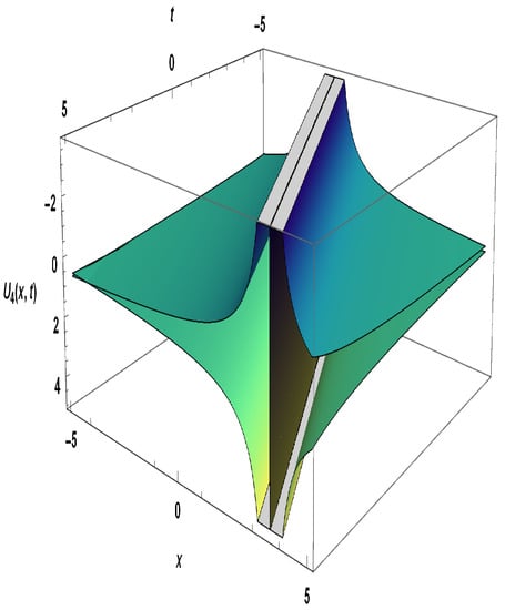 Secondly, the extended simple equation approach has been used to obtain the exact solutions for the negative-order KdV-CBS equation, which is a powerful method to solve nonlinear PDEs. These solutions include solitary wave solutions, specifically singular and dark solitons. In addition, numerical solutions are represented in 3D plots as shown in Figure 1, Figure 2, Figure 3, Figure 4 and Figure 5 to provide physical meaning of nonlinear phenomena. These solutions could be highly useful in comprehending physical phenomena in several disciplines of applied mathematics.