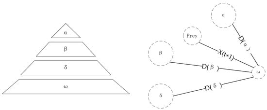 GWO algorithm was inspired by the behaviors and the social hierarchy of the wolves. According to wolves’ social hierarchy, there are four groups which are , , and respectively, as shown in Figure 1. The is the fittest solution which can guide others to go towards the right direction, and are the second and third best solution respectively. Moreover, the is the basement, which provides a large amount of population to support the whole pack.