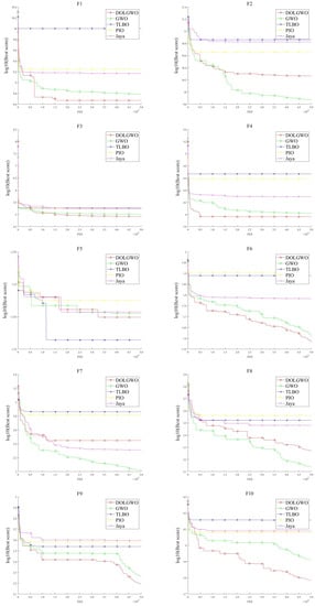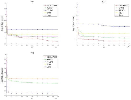 The convergence capability of five algorithms on test functions are plotted in Figure 3, where the ‘Best score’ presents the average of fitness value. As the figures show, DOLGWO converges fast along with the iterative computing, which results from the remarkable exploration capability. As for the gradually converging trend, it is due to the exploitation capability of the DOL strategy.