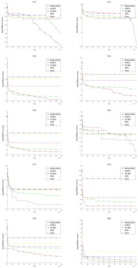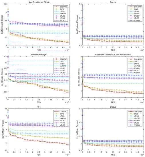 The results for all 23 benchmark functions are shown in Table 9, and the best average convergence results for 6 functions of DOLGWO are shown in Figure 4. It can be seen from these results that DOLGWO algorithm performs the best in all unimodal benchmark functions(3/3) and composition benchmark functions(1/1), in about half of multi-modal(6/13) and Hybrid benchmark functions(3/6).