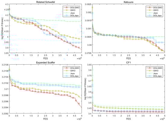 The best average convergence results for four functions of DOLGWO are shown in Figure 5. It can be seen from the results that DOLJaya is better than Jaya and DOLGWO is significantly outperforming GWO, Jaya and DOLJaya. Among the DOL-improved algorithms, DOLGWO is more effective and advanced. It converges faster than DOLJaya and can continue to explore new solution spaces to obtain better solutions. Hence, we can conclude that incorporating the DOL strategy improves the performance of GWO and Jaya significantly. This is because DOLGWO and DOLJaya have a dynamic and asymmetric search space, which increases search exploitation and yields excellent convergence performance.