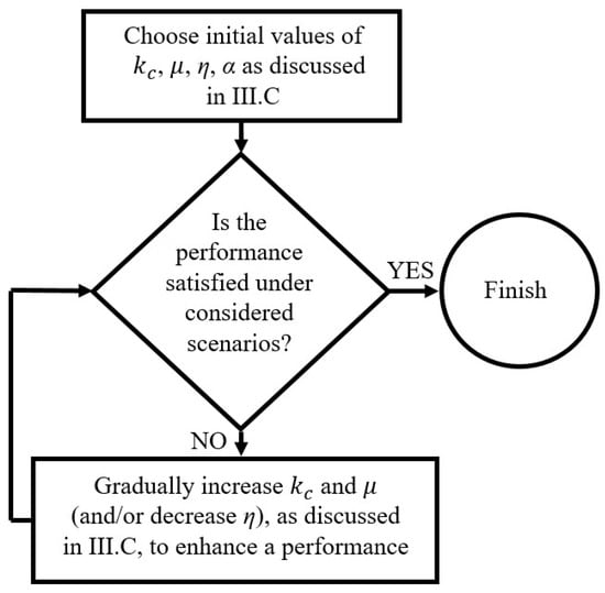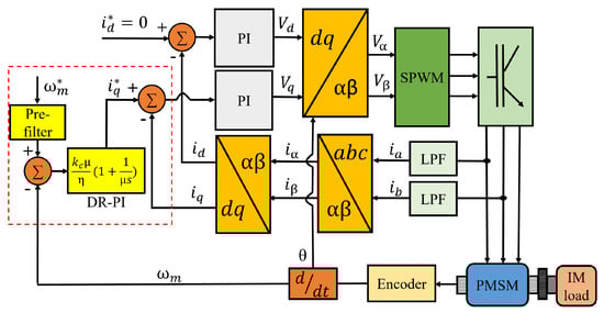 As the final form of the DR-PI controller is a PI controller with a pre-filter, the stability analysis is made very simple by selecting gains to stabilize the characteristic Equation (19). Note that the selection is also discussed in Remark 3. The gain tuning procedure for the proposed DR-PI is presented in Figure 3. The overall diagram of the proposed DR-PI-based control scheme for PMSMs is illustrated in Figure 4.
