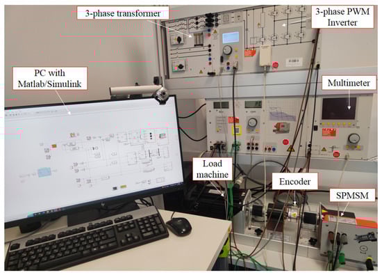 Thanks to its advantages including its high efficiency, compact size, high torque-to-current ratio, high reliability, and recent advancements in permanent magnet (PM) materials, permanent magnet synchronous motors (PMSMs) have become increasingly popular among other types of AC drives [,,,,]. Three classes of PMs such as alnico (alloy of aluminum, nickel, cobalt, iron, and other elements), ferrites, and rare-earth elements (neodymium–iron–boron (NedFeB), samarium–cobalt (SmCo)) are utilized in electrical drives [,]. Precisely controlling the PMSMs is generally challenging task due to their nonlinear characteristics and various sources of disturbance noises such as external load torque, frictions, and sensor noises []. The conventional proportional–integral (PI) controller is widely applied for electrical drives including PMSMs because of its simple structure compared to existing advanced control solutions. Moreover, the PI controller has a disturbance compensation property inside of its control structure, i.e., it takes the tracking error in a speed loop to estimate an offset as well as the external disturbance to compensate [,]. In speed tracking problems of PMSMs, PI controllers are utilized in cascaded form, i.e., one PI controller for the outer speed loop and two PI controllers for the inner current loop. It is claimed that, under the effect of disturbance, an output of the speed controller could cause the improper reference for the -current controller, which in turn leads to degrading the PMSM’s performance []. Moreover, this also reveals that there is a lack of detailed analysis about the mechanism of disturbance rejection in practical PI controllers []. On the other hand, despite the linear and simple structure of the conventional PI controller, it is hard to find a consensus on the rules for tuning the controller parameters. Most famous tuning techniques require a precise plant model, which often prevents the designer choosing appropriate gains for their applications [].