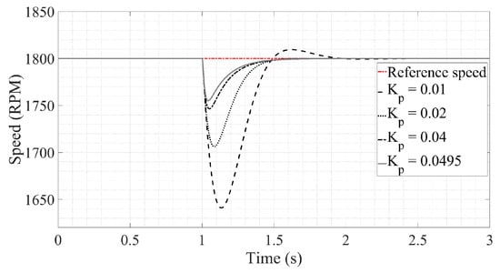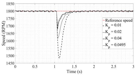 Figure 8 shows the simulation result of the DR-PI controller when a rated load torque is suddenly applied at a constant speed of 1800 rpm (Scenario 2) with different values of proportional gains . Four different proportional gains were tested which reveals that, with higher gains, the DR-PI performs with less drop and overshoot reference speed tracking. Figure 9 shows the current responses for each proportional gain in simulations for this case. On the other hand, Figure 10 and Figure 11 illustrate the experimental results under the same conditions as simulation studies. This reveals that the performance of the system becomes better when the proportional gain is selected as close to 0.0495 as possible. We can also observe that the experimental results show the same trend as indicated by the simulations, although there are some detected differences. Tables The selected control gains of three methods are listed in Table 2. Table 3 and Table 4 summarize the performance of the proposed controller associated with these simulation and experimental studies.