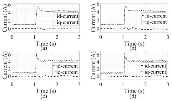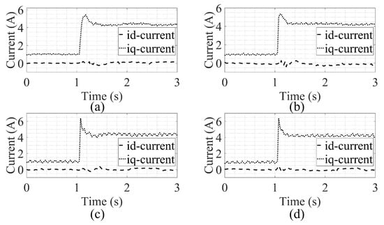 Current response of the DR-PI with a different and constant under Scenario 2. Simulation result: (a) ; (b) ; (c) ; and (d) .