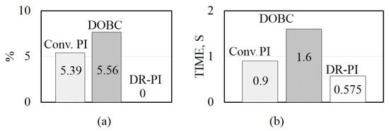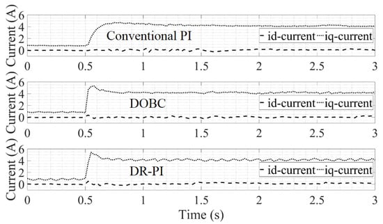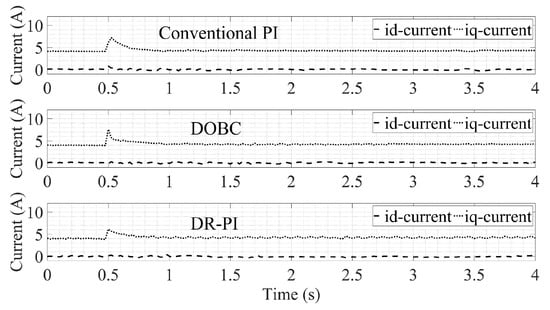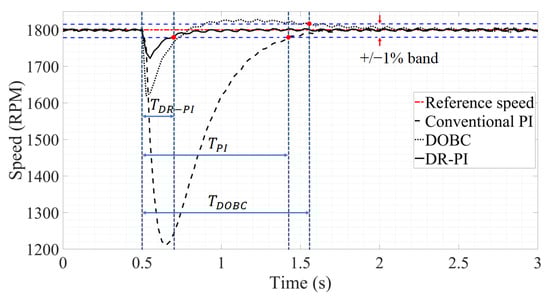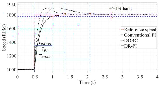 First, the performances of the controllers are analyzed under the constant rated load torque with a speed-change from 1000 rpm to 1800 rpm, i.e., Scenario 1 is presented in Figure 6. Figure 12 shows the speed responses of three controllers. From this plot, it is shown that even though the conventional PI and DOBC have a faster response in initial instances, the proposed DR-PI controller has the best tracking performance, i.e., it converges the fastest with the shortest settling time and no overshoot. Note that the conventional PI is better than DOBC with less settling time, i.e., 0.9 s/1.6 s, to reach and stay within a tolerance band of 1% at the steady state—whereas for the DR-PI, this value is 0.575 s. Furthermore, the highest speed overshoot among three controllers belongs to the DOBC with a value of 5.56%, while the conventional PI and DR-PI, respectively, have values of 5.39% and 0%. This phenomenon is explained by the following reason: DOB is designed for disturbance rejection, however, it has some delays in the disturbance estimation and makes the speed response under the speed step-change condition worse than conventional PI. Furthermore, it is known that an overshoot negatively affects performance by elongating the settling time. The fast convergence of the proposed controller is mainly due to the appeared pre-filter based on the modified DOB which helps eliminate an overshoot and hence makes the overall DR-PI faster than the other two controllers. A fast convergence effect of a pre-filter can also be observed in the work of [,]. Figure 13 presents the associated dynamics of the - and -currents under this condition. The -current for three controllers has a smooth shape and fluctuates around zero, however, the DR-PI can still maintain the current better when the speed change occurs. The performance of three control methods are summarized in Figure 14.