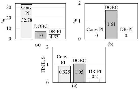 Numerical performance of three control methods under Scenario 2: (a) speed drop; (b) speed overshoot; and (c) settling time.