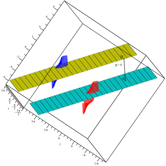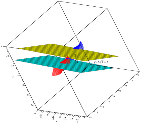 Figure 2. The q-equidistant ruled surfaces and the corresponding asymptotic planes for .Note that similar steps can be followed by considering to find different roots and distinct proper points. - For the striction points, the binormal vectors, the asymptotic planes and the q distance are computed asFor any two points from these asymptotic planeswe have Thus,If again and , then we re-express the last relation as By rearranging the last relation according to , the corresponding roots are found as ; that is, . Note that, in this situation, the asymptotic planes are coincided. See Figure 3.
