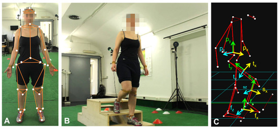 Experimental setup. (A) Reflective markers placement; (B) wooden stairs and participant performing the task; (C) pelvis and lower limbs reference frames (superscript legend as follows: p, pelvis; t, thigh; s, shank; f, foot).