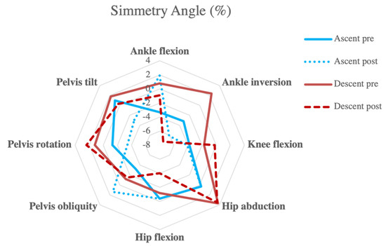 Radar plot showing the average Symmetry Angle (%) change between pre- and post-surgery lower limb joints range of motion.