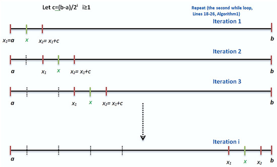 We first test whether is a convergent of or If is not a convergent of or we set the length , and then we repeat taking x as the midpoint between and i.e., and check whether is a convergent of If not, we repeat the previous steps with the length change to be and to be until the midpoint x is greater than For each new midpoint the counter is increased by 1 as long as it does not exceed the maximum number of iterations The loop is terminated either by:
