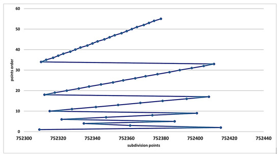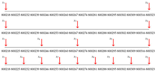 For example, let be an RSA modulus. We have I = [800218, 800326]. Figure 2 shows the generated test points in I for rounds and i.e., we repeat the second while loop (Lines 17–25) of Algorithm 1 three times In Figure 3, we show the generation of the first fifty-five test points in the first 6 rounds (the sixth round is not completed).
