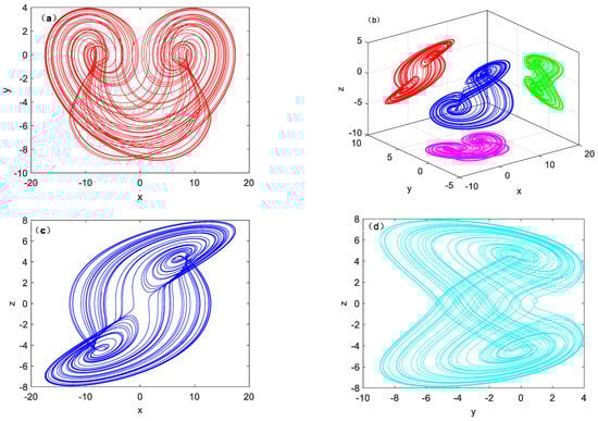 Elementary symmetries are divided into inversion, rotation, and reflection associated with the equations with respect to changing the sign of three, two, and one variable, respectively. The solution of Equation (1) remains constant when it is transformed by (x, y, z) → (−x, y, −z), so the system can be considered as a rotationally symmetric system with respect to the y-axis. In general, a system with coexisting attractors is multi-stable. The system can generate different attractors under different initial conditions with fixed parameter values unchanged.