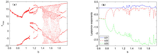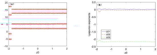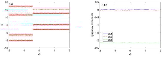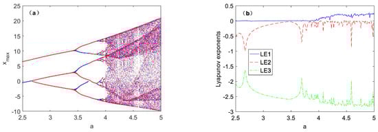 When the value of parameter b is fixed as 1.6 and the value of state variable x is 2.5~5, the coexistence bifurcation diagram is shown in Figure 5a, where the initial conditions of the red bifurcation track are set as (1, 0, 1), and blue bifurcation track set as (−1, 0, −1). The coexistence bifurcation diagram with two different initial conditions under the same parameter a is symmetric with respect to Xmax = 0. Figure 5b shows the Lyapunov exponent spectra corresponding to the two initial conditions under parameter a. It can be seen that the Lyapunov exponential of the chaotic system under different initial conditions is not affected by the initial conditions.
