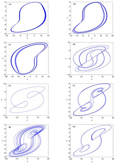 Various phase portraits with different b on the x-z plane. (a) b = 0.98, (b) b = 1.17, (c) b = 1.1, (d) b = 1.2, (e) b = 1.38, (f) b = 1.58, (g) b = 1.6, (h) b = 1.84.