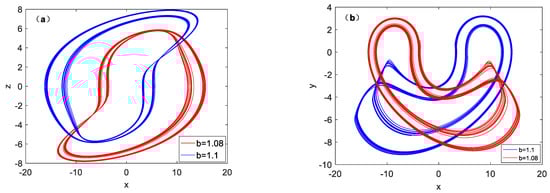 The change of broken attractor with different b, (a) x-z plane, (b) x-y plane.