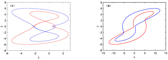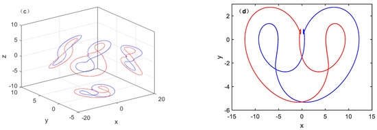 The coexistence attractor phase trajectory is shown in Figure 6. When set the parameter a as 3.67 and parameter b = 1.6, and select two groups of initial conditions (1, 0, 1) and (−1, 0, −1) at the same time. The initial conditions are abbreviated as IC in the following figure. Figure 6a,b,d show that the red track starts from the initial condition(−1, 0, −1), and the blue track starts from the initial condition (1, 0, 1). Figure 6c show the 2 Monge projections. The coexistence attractor is axially symmetric in the y-z plane with respect to y = 0. The coexistence attractor is rotationally symmetric in the x-z plane. Therefore, it can be determined that symmetrically coexisting attractors will be present in the chaotic system under different initial conditions under certain conditions. This conclusion is confirmed by analyzing the symmetries of different topological structures produced by different parameters b and different initial conditions.