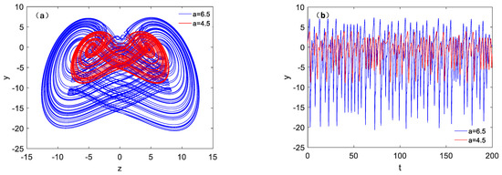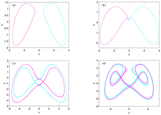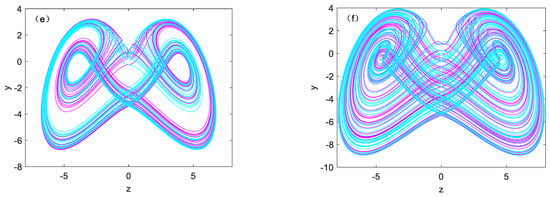 When fixed parameter b as 1.6 and takes different parameter a, coexisting attractor pairs with initial conditions of (−1, 0, −1) and (1, 0, 1) can also be obtained, as shown in Figure 7, where the cyan orbit shows the initial conditions of (−1, 0, −1), and the initial conditions of (1, 0, 1) shows in magenta color. The two kinds of symmetric periodic orbits are shown in Figure 7a–c. Two symmetric double vortex single cycle attractors are shown in Figure 7d. Figure 7e,f shows two symmetric pairs of chaotic attractors. It is worth noting that the variation of parameter a affects the amplitude and frequency of the variable, and has a positive correlation. Figure 8 shows the phase diagram and time variation diagram of system (1).