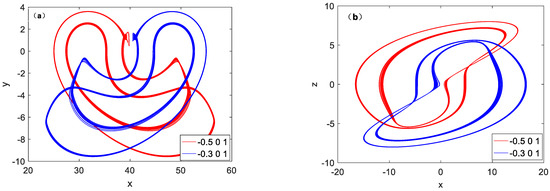 As it is shown in Figure 2a, system (1) converges on the interval of b ∈ (0.6, 1.4), and it can be seen that all Lyapunov spectra in the corresponding region are negative. When the parameter changes to b = 1.4, the system enters a chaotic state and positive maximum Lyapunov spectra appear. When parameter b is in the interval of [1.41, 1.82], the system goes to a chaos state. Figure 3 depicts the phase trajectories of the x-z plane under different values of parameter b. In Figure 3a, when b is around 0.6, the system enters a narrow period window. The system is still periodic within b ∈ [0.6, 1.4]. The system is in period-1 cycle state for b = 0.68. The system is in period-2 cycle state for b = 1.17. The system is in period-2 cycle state for b = 1.1. It is not difficult to find that when parameter b is set to 1.17 and 1.1, Figure 3b,c are symmetric, as shown in Figure 4. In fact, it is the process of attractor aggregation, because of the symmetry breaking, so in the process of parameter bifurcation, it will be presented back and forth between the two broken attractors. Finally, nearby b = 1.84, The system is periodic. Therefore, a crisis of attractor breakage occurs after parameter change.
