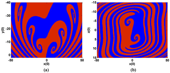 The basin of attraction has predictive symmetry and complex fractal structure. To further verify the multi-stability of system (1), Figure 12 shows the basin of attraction of this system. For the convenience of calculation, the coordinate range is (−50, 50), and the calculation unit of 200×200 is generated by taking 0.2 as the step. In the calculation of Figure 12a, the cross section is z = 0, and in the calculation of Figure 12b, the cross section is y = 0. For each point, the phase orbit is run out through the MATLAB program, and the center of gravity point of the phase orbit generated by the initial value point and the mean value of each signal are calculated through the code. When the difference between the calculated results of two different phase orbits exceeds the threshold, it is marked as another type of attractor. Finally, the basin of attraction is generated according to the results of all the calculated points [54,55]. The same color is used in the attractor pool to show similar chaotic attractors. It is clearly can be seen from Figure 12 that the two regions filled with different colors correspond exactly to different types of attractors.