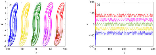 Multi-attractors coexist of system (2) with a = 4.5, b = 1.6, initial conditions IC1 = (−80, 0, 1) (blue); IC2 = (−40, 0, 1) (yellow); IC3 = (1, 0, 1) (green); IC4 = (40, 0, 1) (cyan); IC5 = (80, 0, 1) (red): (a) Phase graph in z-x plane, (b) Offset-boosting time signal x(t).