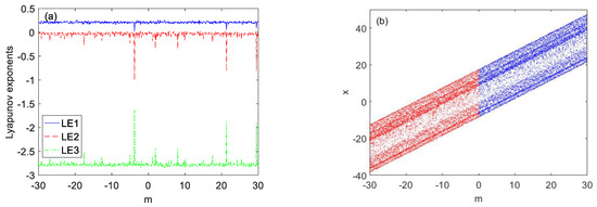 As shown in Figure 14a, the Lyapunov exponential spectrum does not change with the change of offset m. It can be seen from Figure 14b that when parameter m ∈ (−30, 30), the bifurcation diagram of variable x increases in an absolutely linear direction, because the variable x only exist in a third dimension and the third dimension only has a constant.