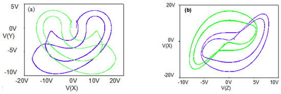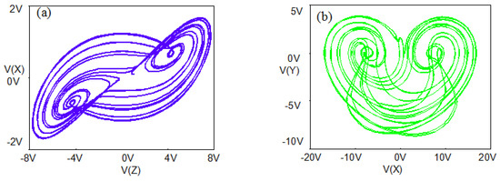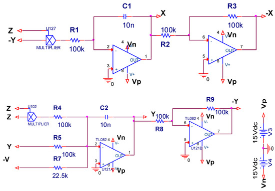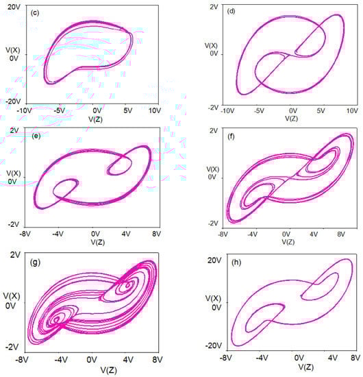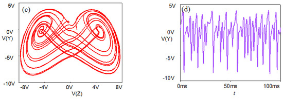 In order to verify the chaotic characteristics of the system. PSpice circuit simulation software is used to design the chaotic system circuit. The system described above is ideal for providing signals with the polarity required for signal processing. The simulation circuit is shown in Figure 15, from which the state equations can be obtained as follows: