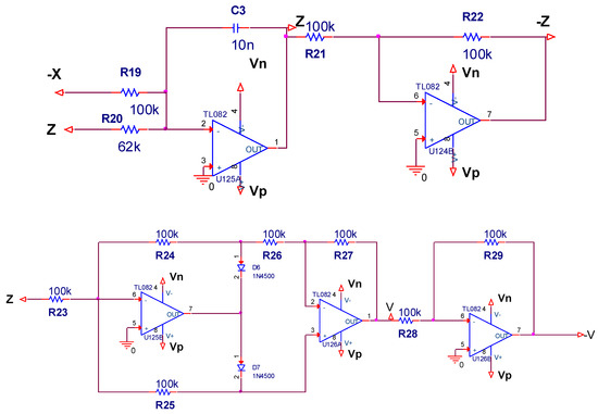 The circuit of the whole system is composed of three channels, which respectively realize x, y, z integration, addition, and subtraction, including operational amplifier LM741, ideal multiplier AD633 for nonlinear product operations, resistors, capacitors, and absolute value function (). State variables x, y, and z in system (1) correspond to the state voltages of the capacitors in three channels. The letter V represents the absolute value of the state variable z. The integration time constant was chosen to be 1 ms in our simulation experiments. In Figure 15, capacitance and resistance values are set as follows: C1 = C2 = C3 = 10 nF, R13 = R14 = R15 = R16 = R17 = 10 K, R1 = R2 = R3 = R4 = R5 = R8 = R9 = R10 = R19 = R21 = R22 = R23 = R24 = R25 = R26 = R27 = R28 = R29 = 100 K, R7 = 22.5 K, R20 = 62 K.