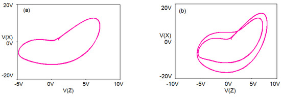 When the system selects different initial conditions, the phase trajectory diagram of the system will run in different states, as shown in Figure 11. It can be seen from Figure 11 that the amplitude range of the state variable x is large, which is not convenient for the implementation of the circuit. The proportional uniform compression of variables can be considered in the circuit.
