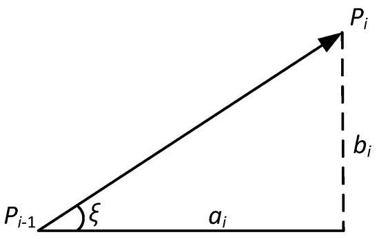(2) Maximum pitch angle: the maximum angle allowed to change when the UAV rises or dives in the vertical direction. As shown in Figure 3, the included angle between the path segment and its projection on the horizontal plane ξ is the rising or diving angle, and the angle calculation is shown in Equation (3).