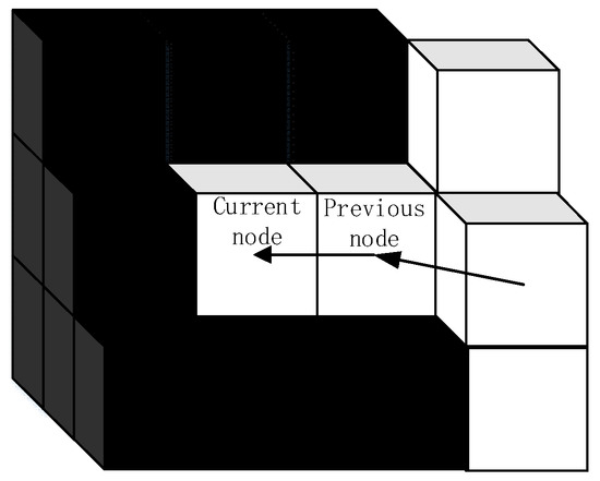 where CG is the guidance of the target point to the current point, SG is the guidance of the target point to the selected node, tx, cx, and sx are the grid x-axis indexes of the target point, the current point, and the selected node, respectively, ty, cy, and sy are the grid y-axis indexes of the target point, the current point, and the selection node, respectively, and tz, cz, and sz are the grid z-axis indexes of the target point, the current point, and the selection node, respectively.