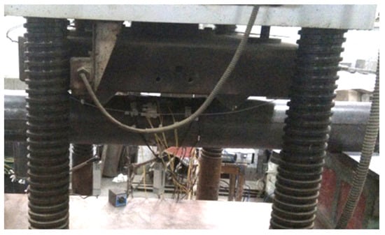The specimens comprise two PHC pipe piles, each of four types, labelled A–D. The specimens are loaded at two points in the third part of the span, with the distance between the two supports = 4.4 m and the distance between the two loading points = 2 m. The loading is carried out by hydraulic jacks, and the symmetrical load is transferred to the specimens by the distribution steel beam, with a pure bending section between the two loading points. The test results of the same type of pipe pile are taken as the average value. A live map of the loading process is shown in Figure 4, and the specific loading scheme is as follows.