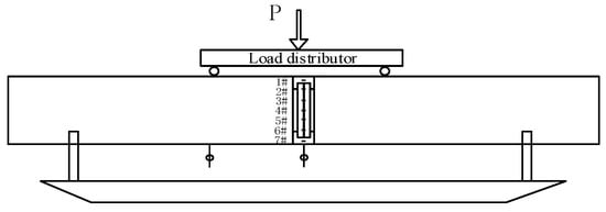 To measure the strain of the joint and the deflection of the pure bending section [38,39], strain gauges are arranged at the joint, and displacement gauges are arranged at the span and loading point. Strain gauges #1–#7 are arranged along the pile cross-section from top to bottom, as shown in Figure 5. The type of strain gauge is BSF120-80AA.