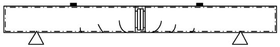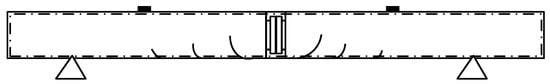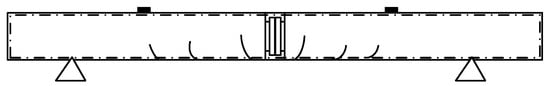 When the bending moment of the pure bending section reaches 99 kN·m, a vertical crack appears on the left and right sides of the joint of specimen B. The width and length of the cracks are 0.64 mm and 240 mm, respectively, at the time of damage. The cracks at the time of damage are mainly distributed in the pure bending section; there are six relatively obvious cracks whose crack patterns are shown in Figure 7.