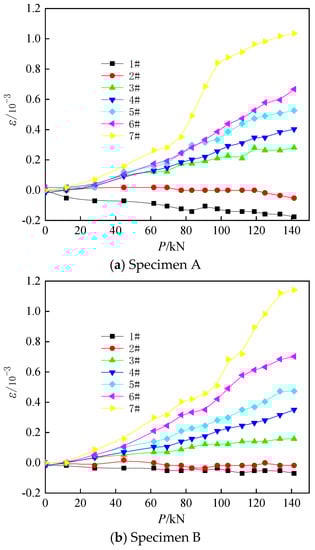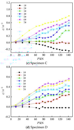 Two sets of three-point loading tests were conducted for each of the four specimens A–D. The test data were taken as the average of the test results of the same specimens between two groups. Figure 10 shows the distribution of clamp strains of the four specimens A–D. The strain is considered to be distorted when the tensile strain of the joint reaches 2.0 × 10−3 (Figure 10), and the distorted strain data are no longer provided. Figure 10a shows the distribution law of strain in the clamp joint as the load increases in specimen A; strain gauge position #1 is under compression, strain gauge position #2 has almost zero strain, and strain gauge positions #3–#7 are under tension. Figure 10b shows that strain gauge positions #1 and #2 are under compression, and strain gauge positions #3–#7 are under tension. Figure 10c shows that strain gauge positions #1 and #2 are under compression, strain gauge positions #3–#7 are under tension, and the magnitude of the strain increases from top to bottom. Figure 10d shows that strain gauge position #1 is under compression and the compression strain is small; strain gauge positions #2–#7 are under tension; and the magnitude of the strain increases from top to bottom. As the load increases, the values of tensile strain and compression strain increase.