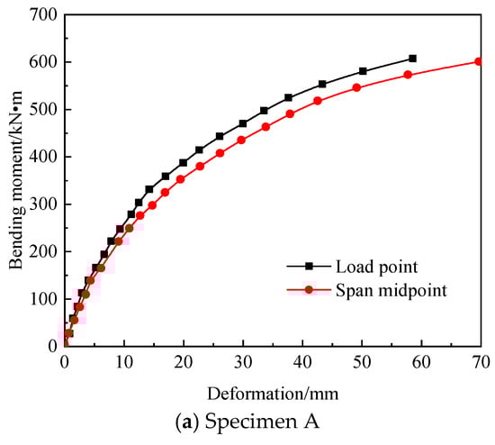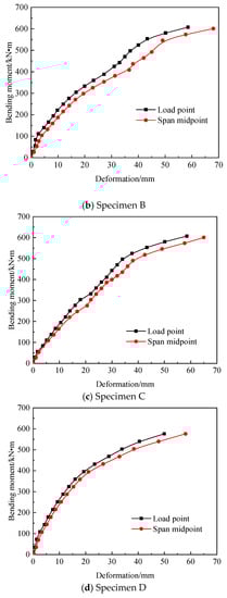 Figure 11 shows the bending moment distribution of the pure bending section of specimens A–D. When the bending moment is small, the mid-span deflection of all specimens is almost the same as the loading point; under the action of the same bending moment, the mid-span deflection of all specimens is larger than the deflection of the loading point.