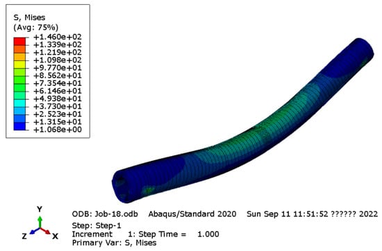 The C3D8R unit is used for pile concrete and clamps, and the T3D2 truss unit is used for prestressed reinforcement and stirrups. In the finite element model, binding constraints are used between the bracket, the curved clamps and the pile concrete, and the concrete and the joint are also bound. The two surfaces in the model are tightly bound together and do not separate during the analysis. The prestressed reinforcement and stirrups are embedded in the concrete according to the embedding zone. The loading process includes the following three stages: the initial stage, prestressing the PHC pipe pile, and application of the pure bending load. The boundary constraints of the model are mainly concentrated on the two supports. Considering that both ends of the pile are loaded during the test, the boundary conditions define one side of the central axis to support U1 = U2 = UR3 = 0, which not only ensures the existence of vertical displacement but also limits the torsional deformation of the pile. The division of the finite element mesh is shown in Figure 12, the mesh at the joint is encrypted, and the cloud of finite element results is shown in Figure 13.