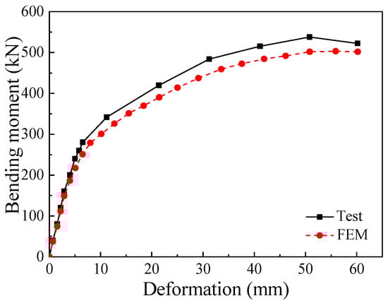 The bending moment–deflection curves comparing the finite element and test results under the three-point load are shown in Figure 14.