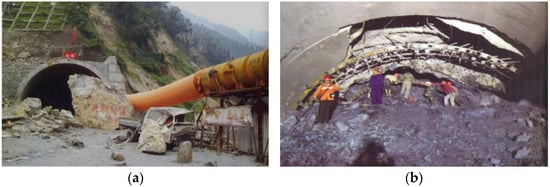 Collapse of the Longxi tunnel during the 2008 Wenchuan earthquake: (a) collapse at the portal of the tunnel and (b) collapse of the lining section [9].