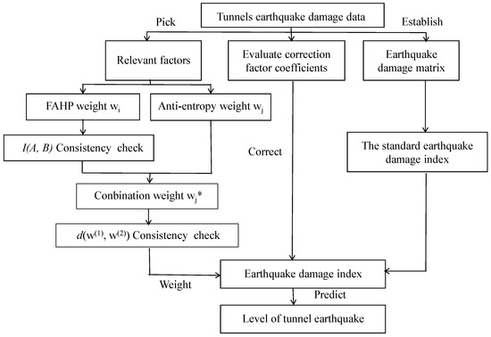 To solve the above problems, this study proposes a prediction method based on the statistical characteristics of tunnel damage in earthquakes. This method uses tunnel damage data as sample data from a region where earthquake disasters have occurred. The standard earthquake damage index of a tunnel is calculated under the tunnel damage classification system, and the anti-entropy–fuzzy analytic hierarchy process (FAHP) combination weighting method is proposed to combine weights of the predicted evaluation factors. The correction coefficient of each evaluation factor is calculated to correct the weights by considering the degree of each evaluation factor’s influence on the average damage index. Finally, the weighted calculation of the average earthquake damage index of the tunnel and its corresponding damage level are calculated. This method can comprehensively consider various factors of tunnels when earthquakes occur and clarify the relationship between these factors and the correction coefficient of a single factor. The study can improve the reliability of tunnel earthquake damage prediction and attract attention for establishing detailed data platforms of tunnel damage due to earthquakes in the future.
