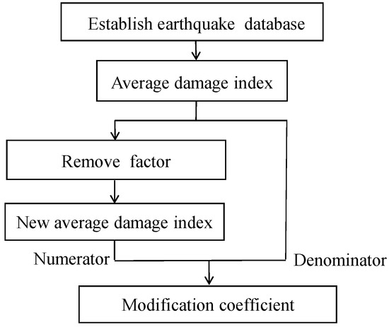 The earthquake damage matrix of tunnels in a region can comprehensively reflect the overall seismic capacity of the tunnels in the region, and the average earthquake damage index at each intensity can represent the seismic level of such structures at the corresponding seismic intensity. Based on this, it is necessary to consider the influence of each single evaluation factor on the average earthquake damage index. Firstly, the data of two cases in the monomer sample database are calculated; one is to remove the factor and the other is not to remove the factor. Then the contribution of the two cases to the earthquake damage matrix are compared to obtain an impact factor. The ratio of the two cases is the correction factor of the predicted evaluation factor, as shown in Figure 3. The specific calculation steps are as follows: