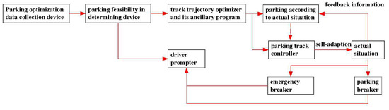 Automatic parking path optimization is a necessary calculation link for intelligent automatic parking. The intelligent automatic parking control system contains a parking optimization data collection device, track trajectory optimizer and its ancillary program, parking track controller, parking feasibility in determining device, emergency braker, parking braker, etc. [22]. The specific design structure diagram of automatic parking control system is shown in Figure 2.
