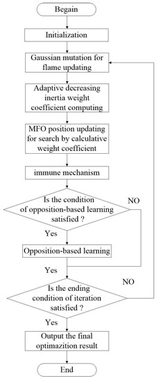 The design highlights of the improved automatic parking path optimization based on the improved immune moth flame algorithm (IIMFO) is the balance maintenance mechanism for global search and local development. Aiming at improving the balance quality, the OBL strategy, immune mechanism, and adaptive decreasing inertia weight coefficient are integrated into the moth flame algorithm.The flowchart for the improved immune moth flame algorithm is shown in Figure 5.