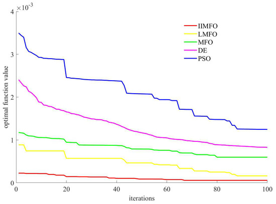 As shown in Figure 7 and Table 2, compared with LMFO, MFO, DE and PSO, the improved immune moth flame optimization algorithm is most ideal, and its optimal minimum function value is , the optimal function value is .
