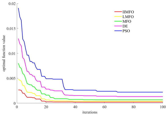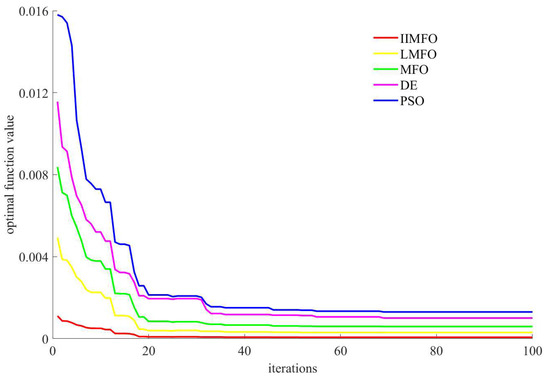 As shown in Figure 6 and Table 1, compared with LMFO, MFO, DE and PSO, the improved immune moth flame optimization algorithm is most ideal, and its optimal minimum function value is , the optimal function value is .