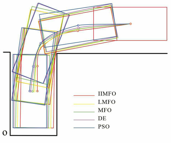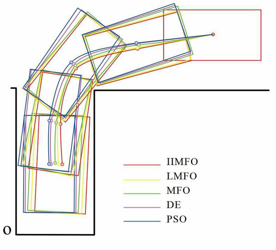 As shown in the automatic parking path curves and related results using Volkswagen UP and Honda XR-V (Figure 9 and Figure 10 and Table 4 and Table 5), compared with MFO, DE and PSO, under the premise of no collision avoidance of the side line of the vehicle garage during the parking process, the automatic parking path obtained by IIMFO is smoother and shorter. This indicates that IIMFO proposed in this paper has a stronger optimization effect and has more advantages in intelligent parking.