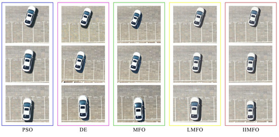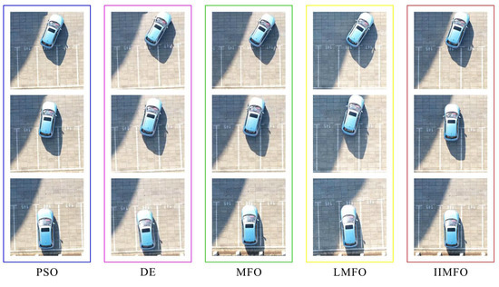 In this paper, semi-automatic experiment comparison based on intelligent automatic parking was implemented on several calm, cloudless days. The parking path optimization method adopts the improved immune moth flame optimization algorithm proposed in this paper (IIMFO), improved version of moth flame optimization algorithm based on Lévy-flight strategy (LMFO), moth flame optimization algorithm (MFO), differential evolution (DE) and particle swarm optimization (PSO). The three vital fixed points were filmed using the Mavic 2 DJI’s unmanned aerial vehicle. The specific filmed vital fixed points for the semi-automatic parking process using Volkswagen Toyota LeiLing Shuangqing 185T Sportline and FAW Senya r7 are shown in Figure 12 and Figure 13.