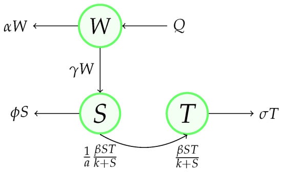 The explanation of Figure 1 is as follows. The mangroves take the total nitrogen from the source and convert it into biomass. It is supposed that a filter prevents debris from falling into the pond. The concentration of the total nitrogen input rate is a constant, denoted as Q. The loss of total nitrogen in the wastewater due to runoff or evaporation is . The total nitrogen exchange rate between the wastewater and soil solution is . The growth rate of the mangroves follows the Michaelis–Menten kinetics . The ratio of nutrients consumed to the biomass generated by the mangroves is represented by the yield constant a. In [2], the yield coefficient was assumed to be a linear function of S. However, in this paper, we studied the model with a constant yield. Through leaching or denitrification, the total nitrogen is lost in soil solutions at the rate . The litter fall rate is .