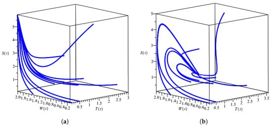 Phase portrait of the system (1) with some initial conditions. Panel (a) is for , and Panel (b) is for .