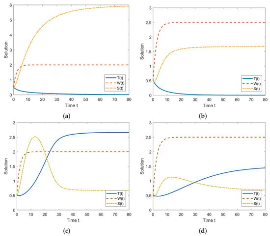 Various solutions of the system (1). (a) The solutions converge to with and . (b) The solutions converge to with and . (c) The solutions converge to with and . (d) The solutions converge to with and .